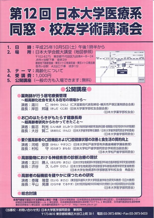 平成25年10月25日(土)日本大学会館大講堂に於いて第12回日本大学医療系同窓・校友学術講演会が開催されました