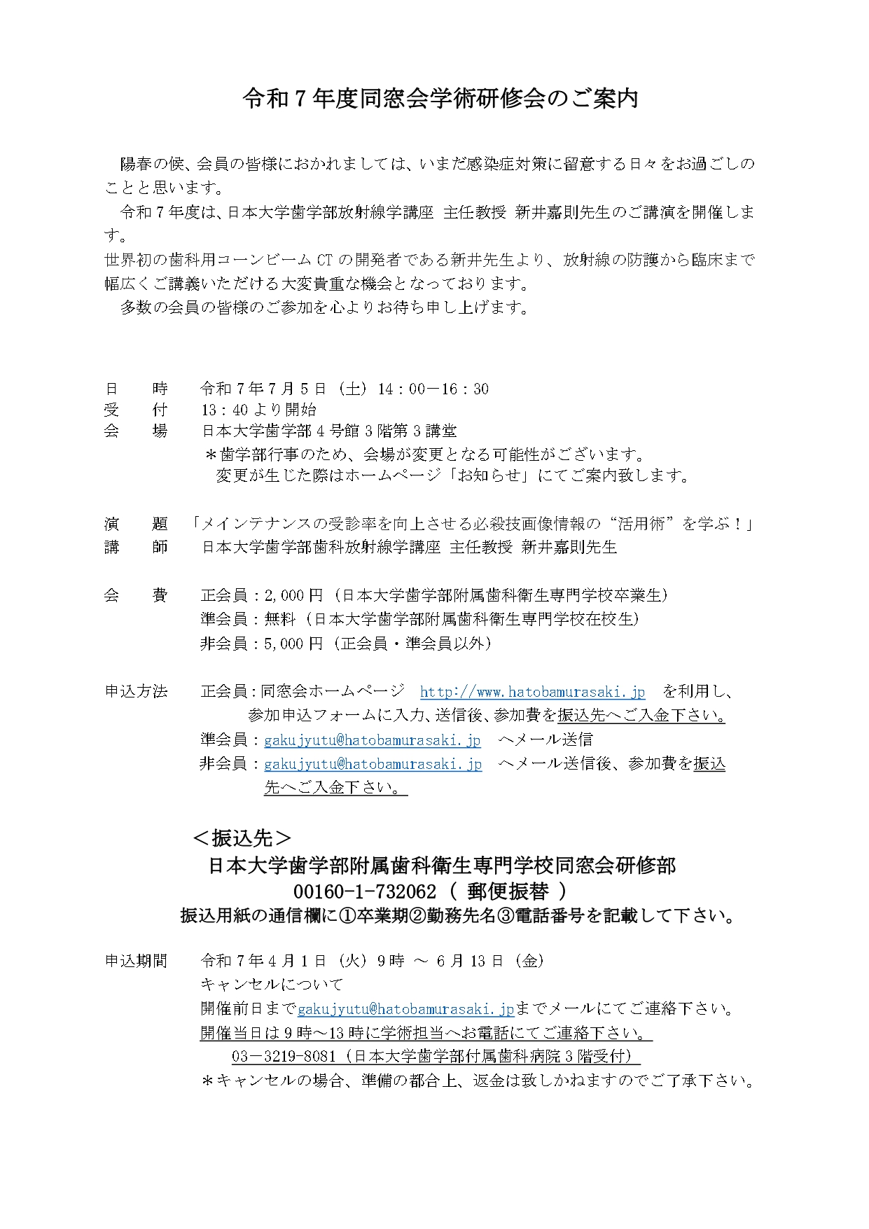 【歯科衛生専門学校同窓会よりお知らせ】令和7年度同窓会学術研修会のご案内